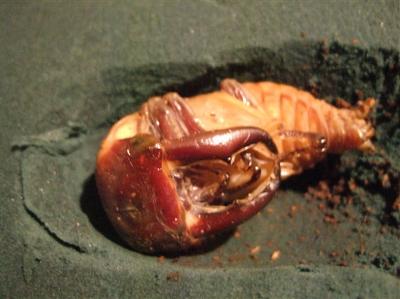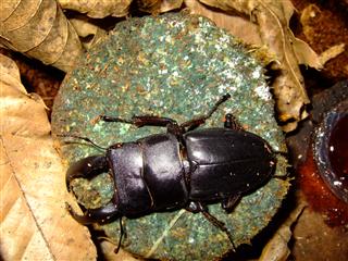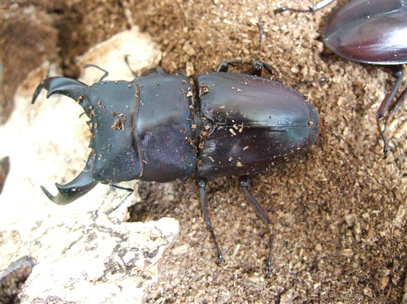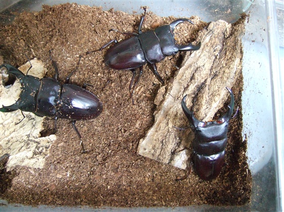 採集年月日 2005/7/24 採集地 沖縄県石垣市川平地先で購入 2005/9/4 はっきり言って、ワシの飼育のポリシーからは逸脱してしまっている。 本当はこのクワガタを購入するべきではなかったと後悔しているが、息子が旅行の記念にと せがむので買ってしまった。 このサキシマヒラタは、ヒラタの中でも古い時代に本島の同種から隔絶された為に独特の 進化をし本土のヒラタからは亜種とでも呼べるほど異なった性質を持つに至っている。 悪い事に、最初からペアで購入してしまったのですでに交尾が完了していると思われる。 飼育ケースは、中型プラ・ケースでマットを18〜20センチ入れ、朽木を中央に立てて埋めて ある。 すでに朽木は激しく齧られて、メスはマットにもぐっている事が多い。場合に拠ってはすでに 産卵を開始してしまっているかも知れない。 非常に不本意である。 この種を繁殖させた所で、元の生息地には到底戻しに行く事は出来ない。 塁代はできるならこの代で終わりにしたいと思っているが... 幼虫が生まれてしまったら困るなぁ 2005/912 オスのサキシマの脚が1本取れてしまっていた。なんでだろう? メスに喰いちぎられたのだろうか? この状態で越冬できるのか不安である。 2005/9/15 何と今日見たらケースの中に幼虫らしき生き物が居た。かなり驚き! 朽木も調べてみたが、あちこちに齧った後が有り、ちょっと材を削ったら幼虫が出てきた。 もうすでにかなりの数の卵を産んでいるいるようだ。 幼虫はまだ初齢で、透明に近い。一体、何匹位産んでいるのだろう? 困ったなぁ〜。サキシマヒラタが増えても石垣島までは返しに行かれないぞ。 どうしよう、困ったなぁ。2005/10/12 今日、幼虫の飼育ケースを調べたら幼虫が全滅してしまっていた。 一体何が原因だろう? マットか?温度か? マットは奈良オオクワセンターのカロリーマットだった。 温度は、保温の発泡ケースに飼育ケースを入れていたが、18℃位だった。 石垣島で18℃と言うと、真冬に何日かある程度だろう。 昨日の天気予報で石垣島を見たら、30℃近くあるようだった。 やはり関東地方でサキシマヒラタを飼うには温室が必要なのだろうか? 幸い、親のペアはまだ元気なので、来年と言う希望も無いとは言えない。 まぁ、サキシマを殖やしてもしょうがないと言えばしょうがないが。 残念ながら、今年のブリードは失敗でした。 2005/11/09 サキシマの越冬用ケースを見ていたら、ケース底に幼虫が居た! たった2匹だが、1齢になったばかりの小さな幼虫が丸まっていた。 サキシマをこのケースに入れたのが10/26だから、直後に産卵したとみえる。 先に生まれた幼虫を全滅させてしまったので、今度は大事に育てたい。 上手く行くかかなり不安! 2006/10 2005年に生まれた幼虫は、2006/6〜7月に3匹が成虫になった。 オスは親より若干大きい60ミリ程度、メスは40ミリ前後。 その後、WDのメスとF1のメスが又卵を2〜30個産んだが、幼虫4匹をのこして 近所のクワ友Jさんの家へ里子に出て行った。 2007/01/ 2006年に生まれた幼虫は、一番大きいのが20g程度。 去年は冬の間、室内で20℃程度に加温していたが、今年は暖冬なので室温だけで飼育。 それでも平均18℃位ある。 多分、羽化は5月頃だろう。 2007/5 残った幼虫4匹は全てオスとして羽化した。 サイズは60〜70ミリだったが、4匹のうち1匹が羽化不全、2匹が休眠中に死亡して現在は1匹しか残っていない。 メスが1匹も生まれなかったので累代はこれで終了である。